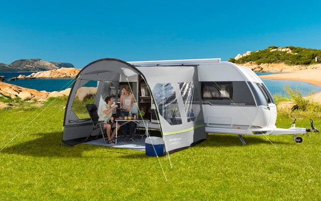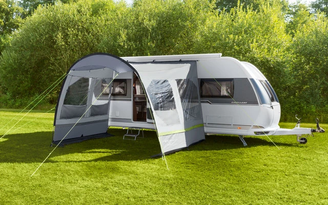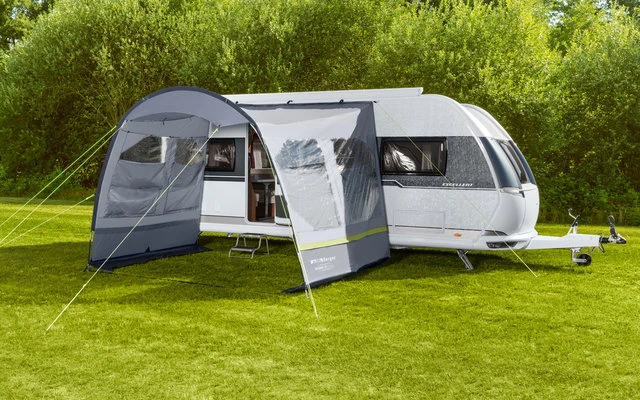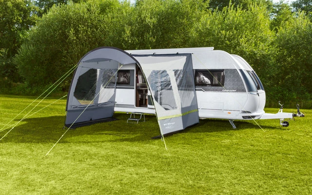 GerĂ€umiges Sonnenvordach mit groĂen Fenstern (von innen blickdicht verschlieĂbar).