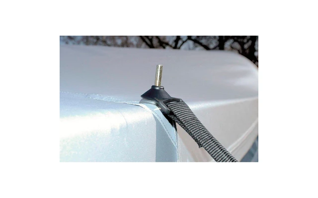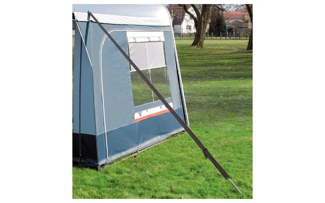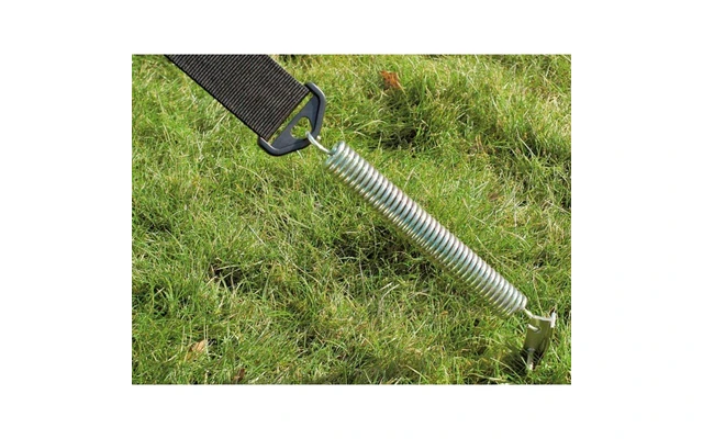 Herkömmliche, ĂŒber dem Zelt liegende Sturmgurte können durch Scheuerndas Dachgewebe beschĂ€digen. Fest angenĂ€hte Sturmsicherungen können die Naht- und Gewebebereiche unnötig belasten.Das Sturmsicherungspaket Mistral hingegen sichert das Vorzelt am GestĂ€ngedornder Eckwinkel, einem der stabilsten Punkte eines Vorzeltes. Die Abspannung erfolgt mit schweren Gewebegurtenund robusten Ankerheringen. Eine dazwischen gesetzte Stahl-Spiralfeder gleicht durch Windböen hervorgerufene ReiĂ- und ZugkrĂ€fte aus.