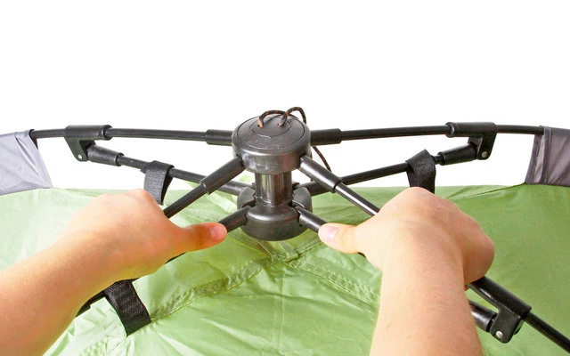 Automatik Kuppelzelt mit Doppeldach und praktischem Vorbau. Dank modernem GestÀnge mit integrierter Seilzugtechnik sekundenschnell aufgebaut und einsatzbereit. Vormontierte Abspannleinen. Kompaktes Packmaà bei geringen Gewicht. Mit Packsack.