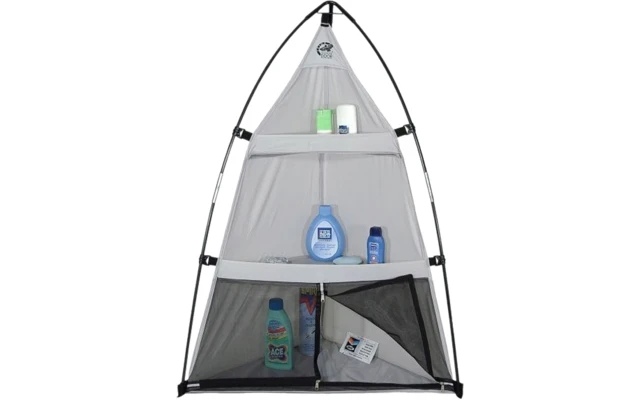 Freistehender Zeltorganiser mit drei Ablagen. Unterste Ablage mit Moskitonetz. Kompaktes PackmaĂ.