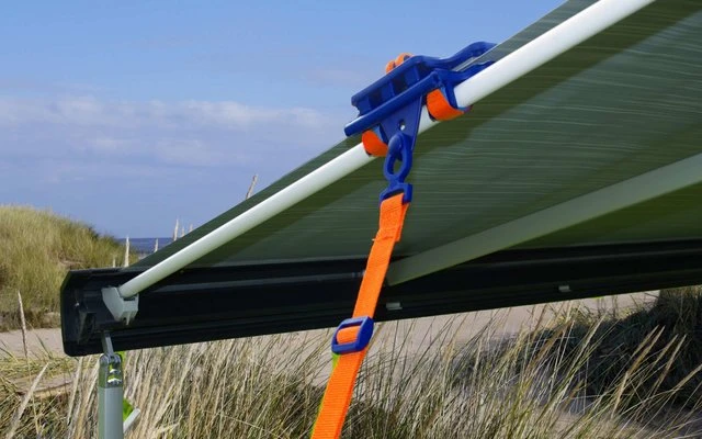 Diese Markisenklemme reduziert das nervige durch den Wind erzeugte âFlappernâ des Markisentuchs fast gĂ€nzlich. Einfach die Klemmvorrichtung seitlich auf das Tuch schieben, an den vorhandenen, beidseitig angebrachten Raftern bzw. Federstangen der Markise anlegen, den Hebel andrehen und durch Umlegen verschlieĂen. Die Klemmkissen halten das Tuch es ohne es zu beschĂ€digen. AnschlieĂend werden Silikontape um die Stange gespannt und in die, je nach Stangenumfang, entsprechende Rasterlochung eingehakt. Kompatibel mit dem Tie-Strap fĂŒr mehr StabilitĂ€t mittels Einzug in die vorhandene Kederschiene. Anbringung an fast allen Markisensystemen möglich, egal ob mit runden, ovalen oder eckigen Rafterstangen.